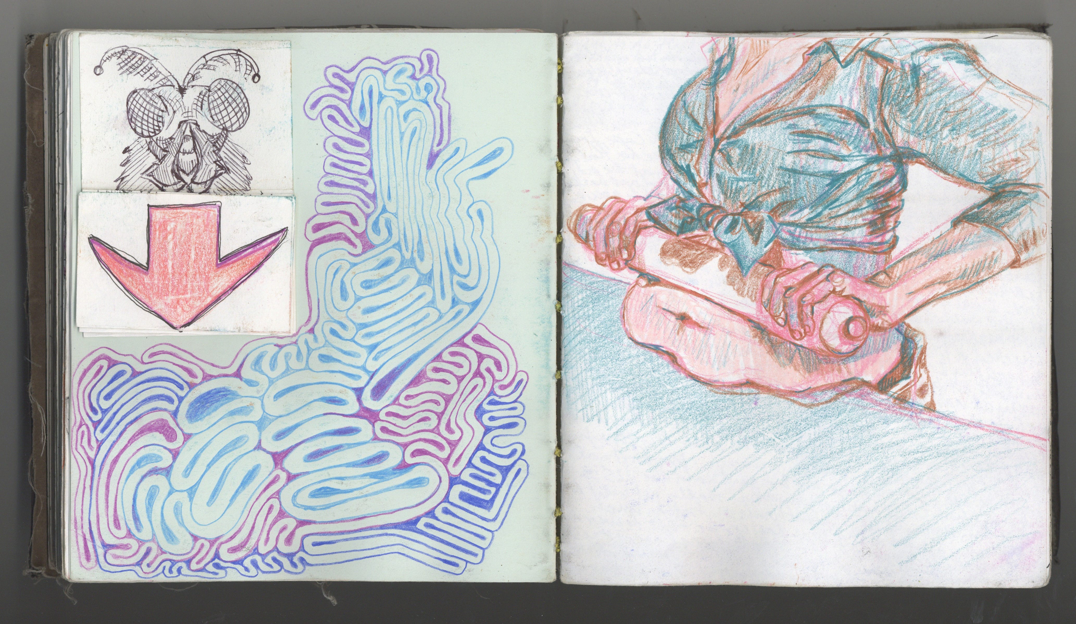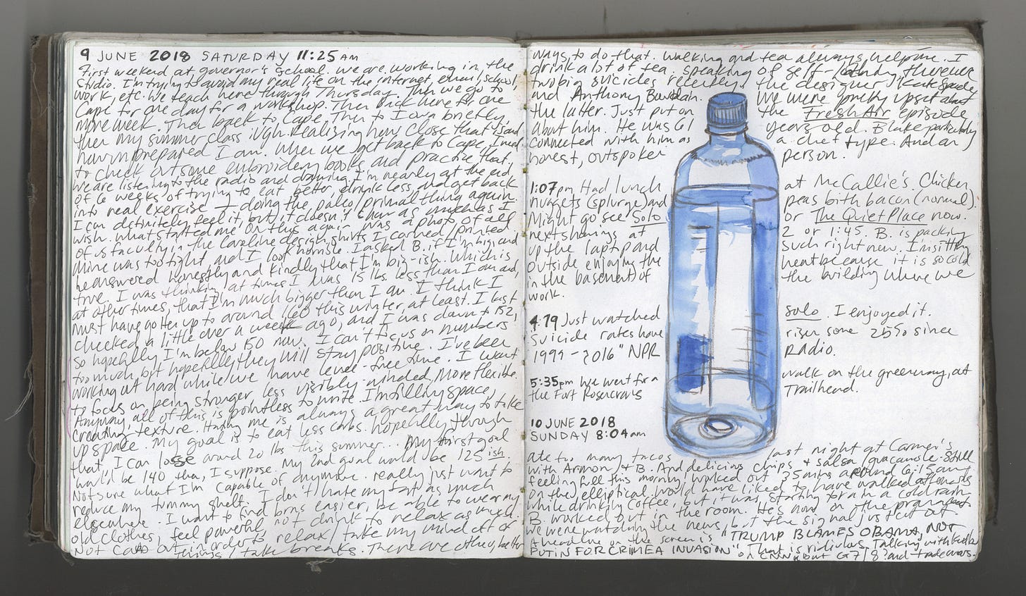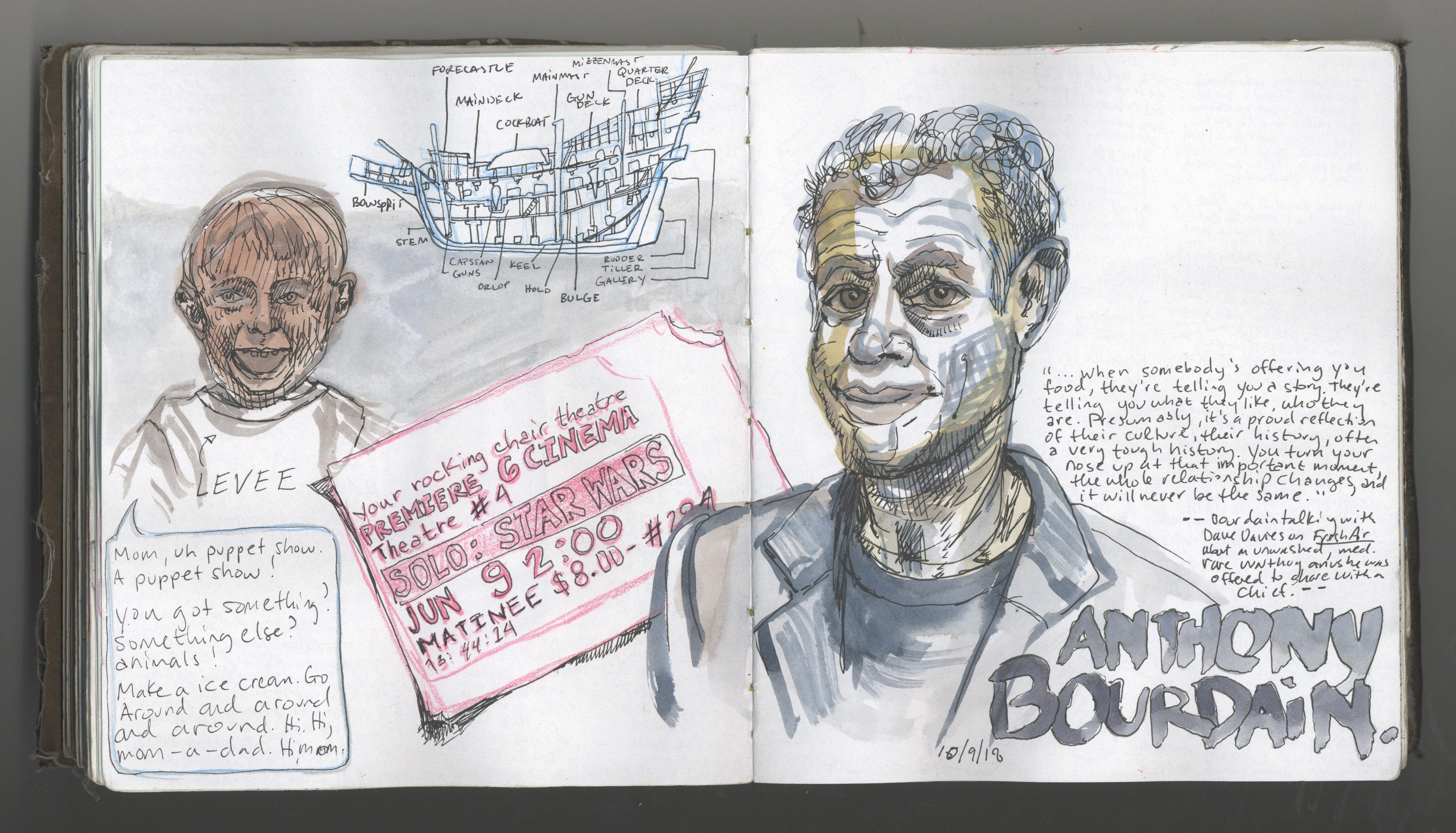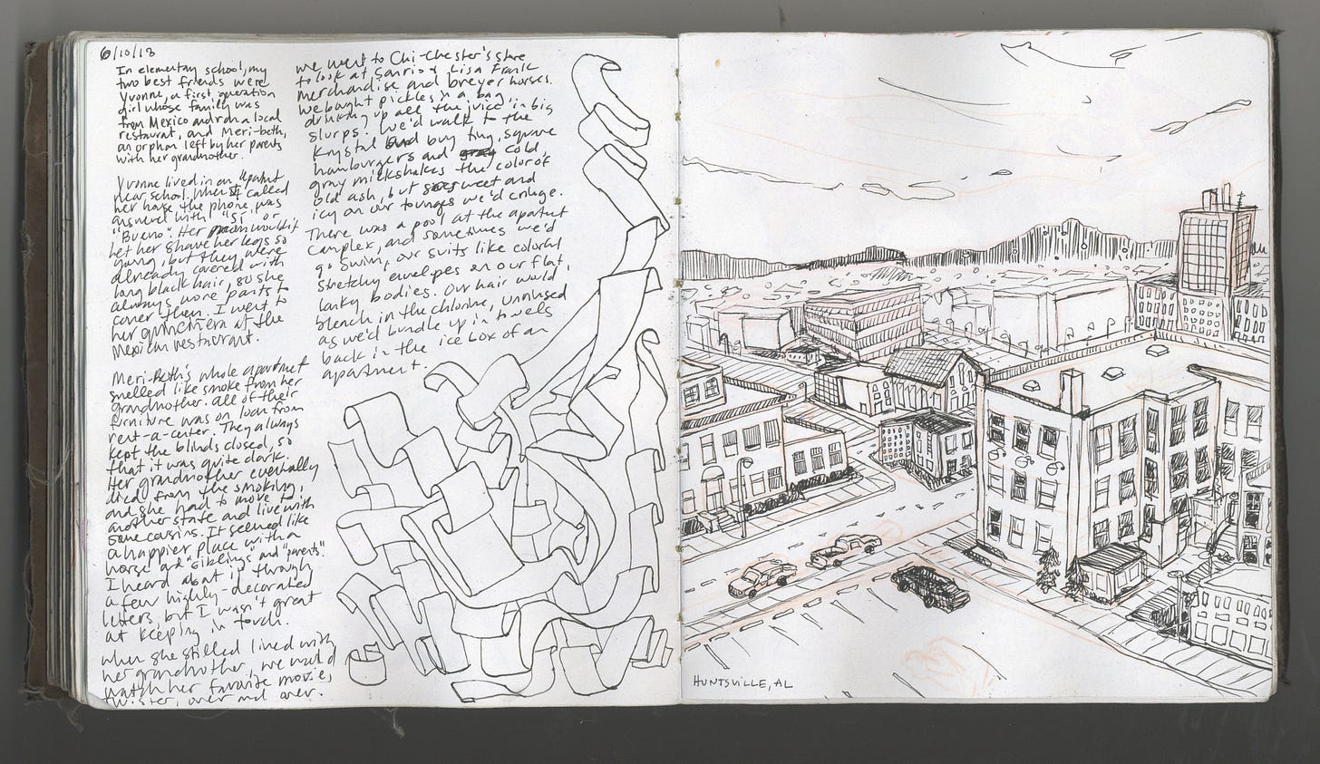These scans are from a sketchbook from Summer of 2018.I believe all of these were created while I was in residence at Middle Tennessee State University, teaching a “sketchbook bootcamp” class with my partner, Blake, for Governor’s School. Gov School is a place for high school students gifted in the arts of music, film, art, etc. to come take classes on a college campus for the summer.