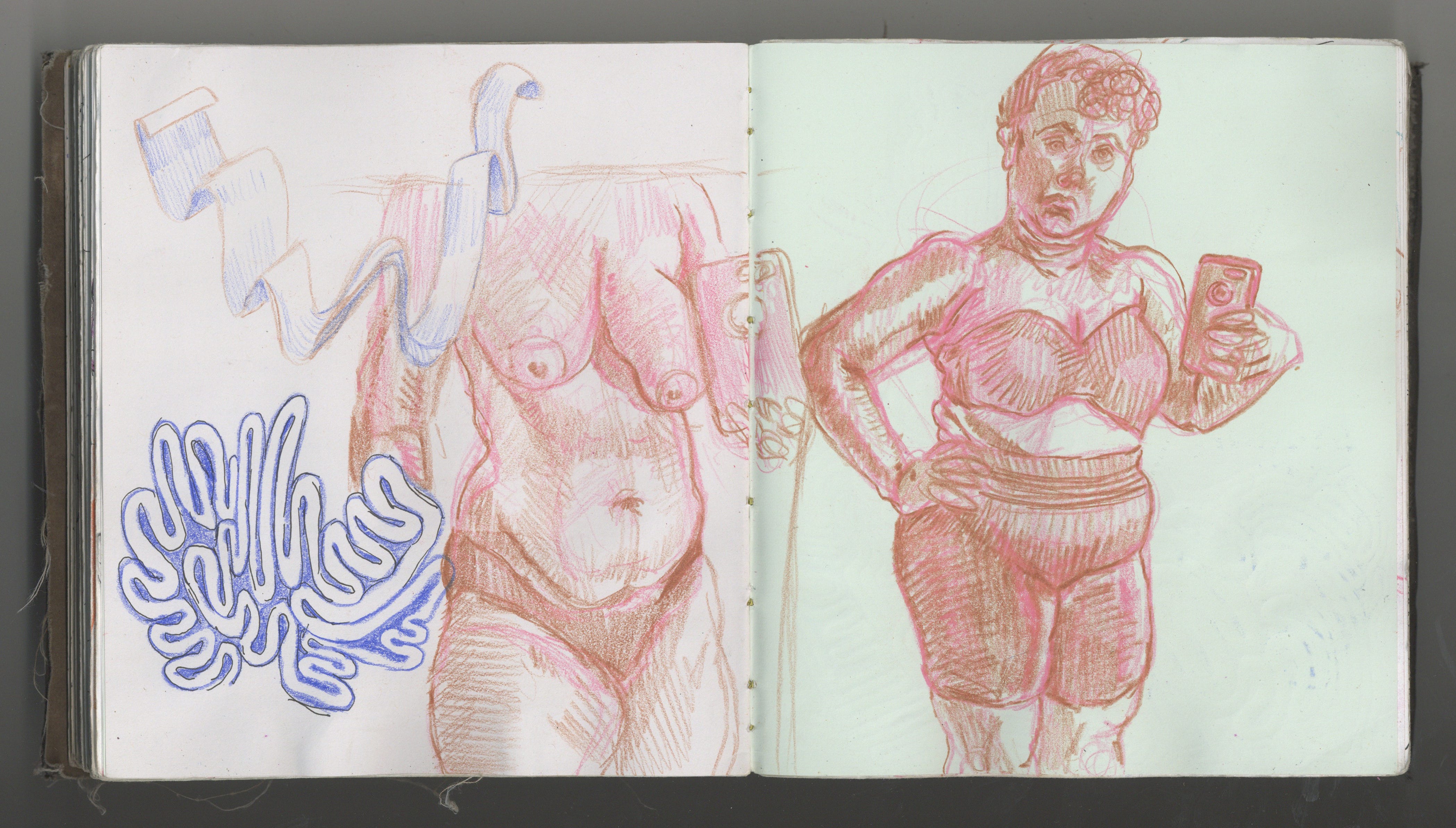 The woman rolling her apron belly above is from a meme going around the internet at that time. I usually cite all of my sources for studies in my sketchbook, but failed to do so here. So I just did a bit of searching and found the woman is named Christine, and this image was about her weightloss and a yahoo series she made about it. I see the image now as a celebration of the body as is.